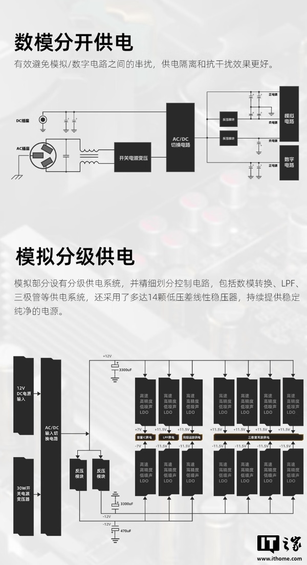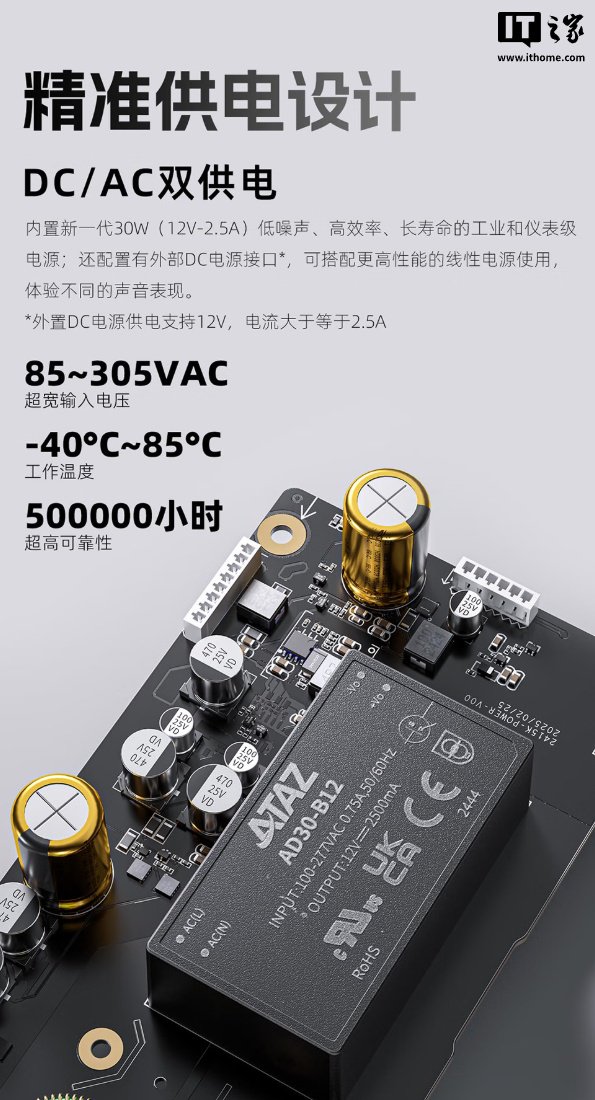 内部设计方面,该耳放的内部电源、数字、模拟部分采用独立的分板布局,可避免物理结构上的相互串扰;供电部分采用 DC / AC 双供电,内置 30W(12V-2.5A)工业仪表级电源,另配置有外置 DC 电源接口,可外接更高性能的线性电源。