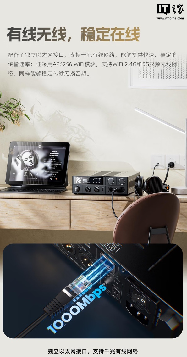 流媒体(隔空播放或 Roon):可通过 2.4G / 5G WiFi 或千兆以太网接口连接