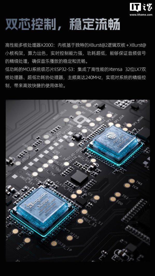 核心性能方面,该耳放内置 X2000 多核处理器,同时配有 ESP32-S3 MCU 芯片,可带来高效快捷的使用体验。