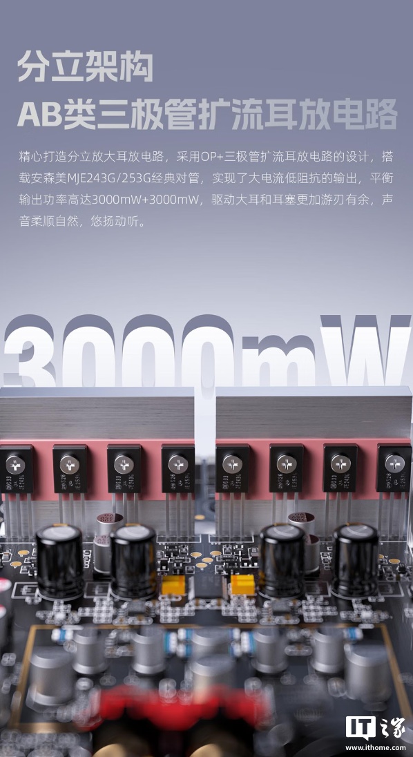 据飞傲介绍,该耳放搭载两颗 AKM 车规级 AK4497SVQ DAC 芯片,内部放大电路采用 OP + 三极管扩流设计,搭配安森美 MJE243G / 253G 对管,可实现大电流低阻抗输出,平衡输出功率最大可达 3000mW+3000mW。