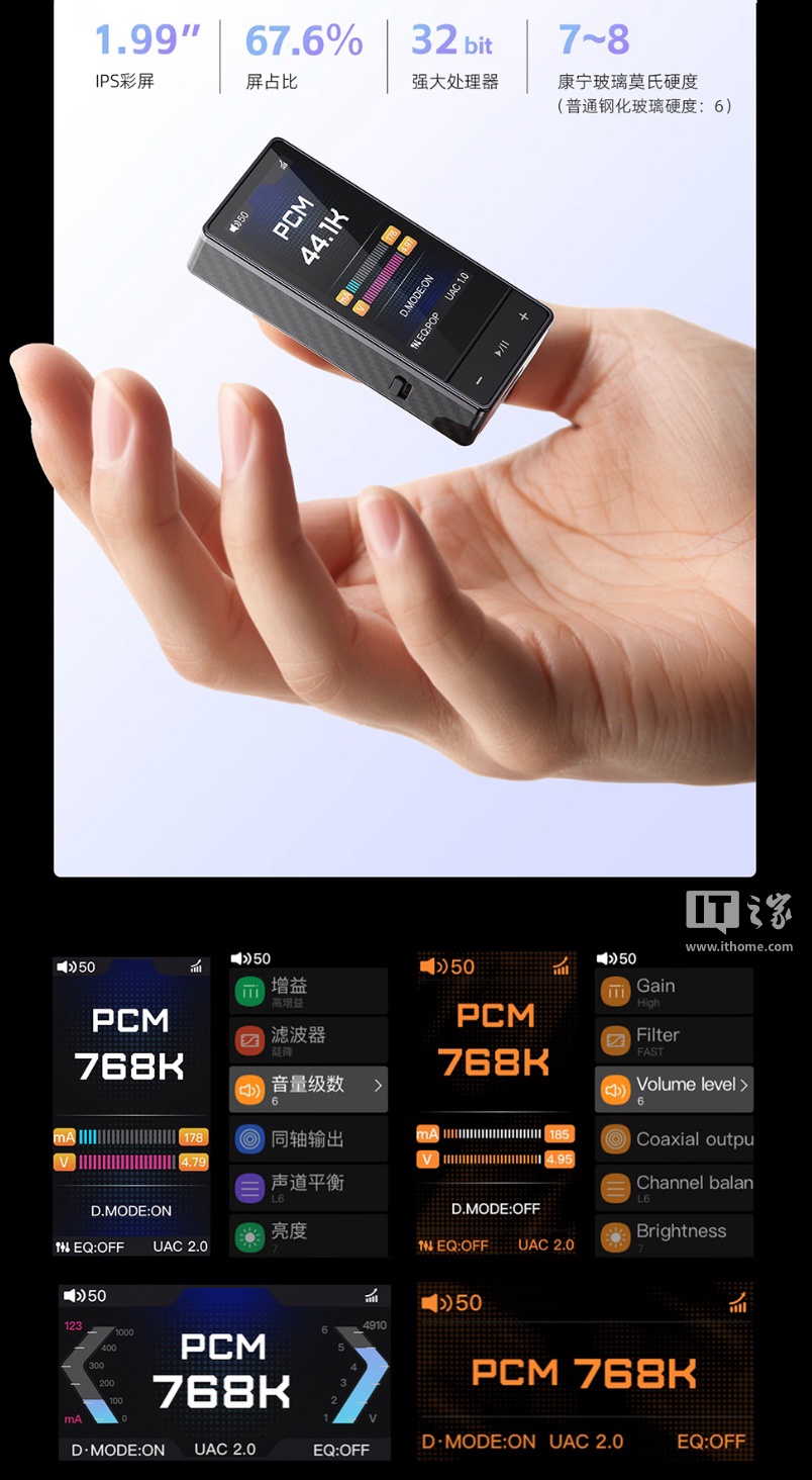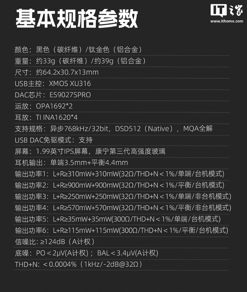 这款解码器采用全碳纤维机身,提供 1.99 英寸 IPS 彩屏,内置“台机级别 ES9027PRO DAC”,配备 6 颗 Ti 音频运放,拥有专属台机模式,提供双 USB-C 接口(可用于分开数据传输 / 独立供电)。