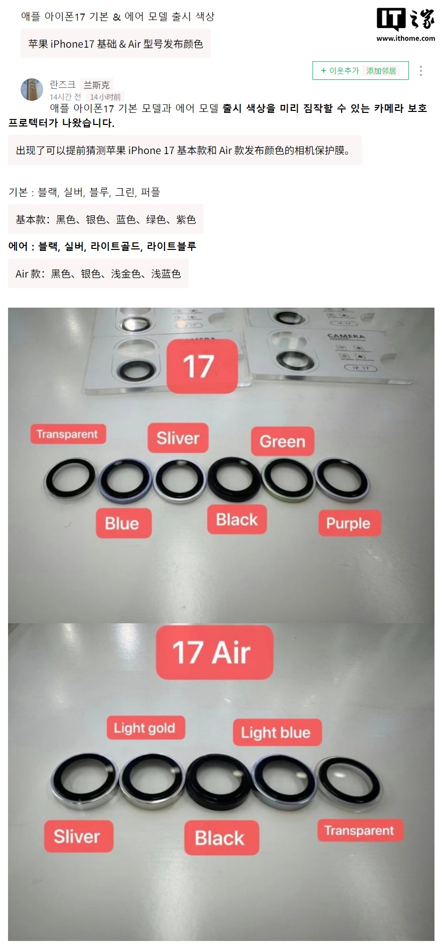 爆料人 yeux1122 今日发布了据称是苹果 iPhone 17 和 17 Air 的镜头保护圈配色,分别对应了手机配色: