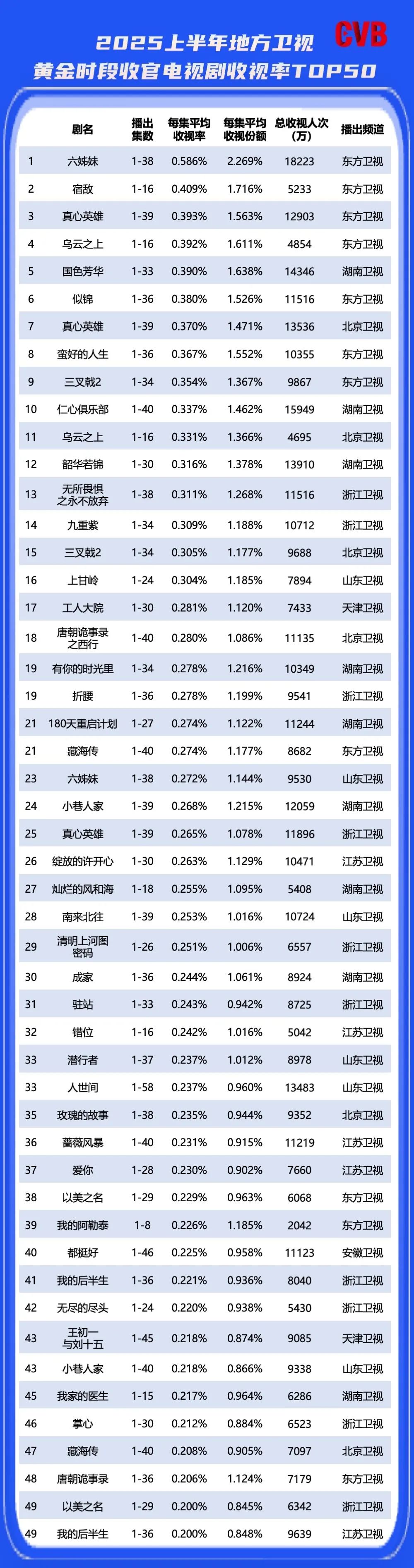 今年大年初六登陆央视一套的《六姊妹》收视反响热烈,一经播出即展现出超强的收视吸引力,该剧全剧收视率 4.349%,成为 CVB 自 2018 年有记录以来唯一全剧平均收视率超过 4%、单集超过 5% 的剧目,收获观众欢迎。
