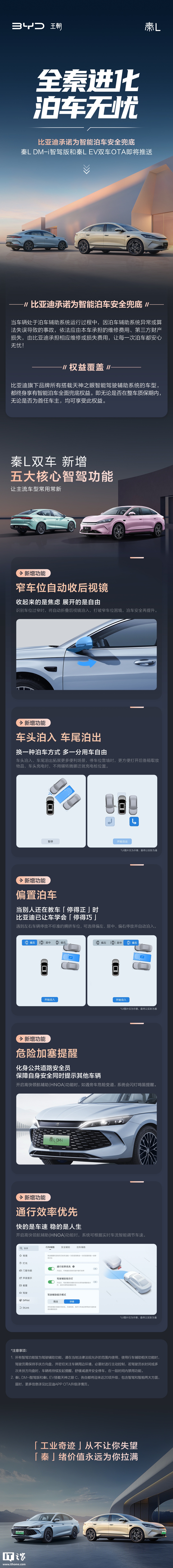 比亚迪介绍称,秦 L DM-i 智驾版和秦 L EV 双车即将 OTA 推送,新增五大核心智驾功能:
