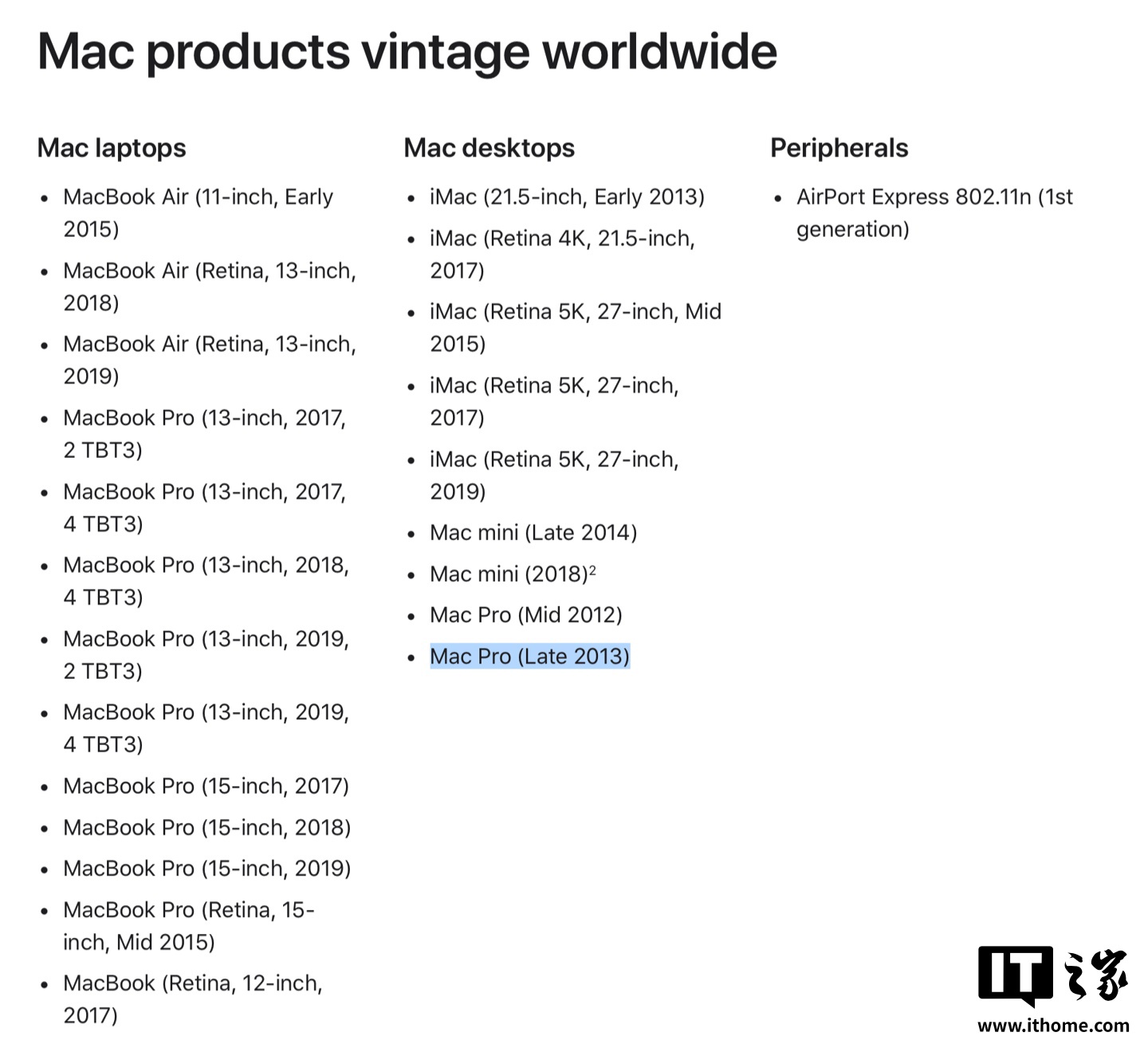 IT之家 7 月 12 日消息,苹果官网今日更新了“过时产品清单”,新增多款 Mac、iPad 和配件产品,其中最受关注的是 2013 款 Mac Pro(IT之家注:俗称“垃圾桶”),这款产品因其独特的圆柱形机箱曾引发热议,但也因内部可扩展性不足、散热不佳而饱受批评。