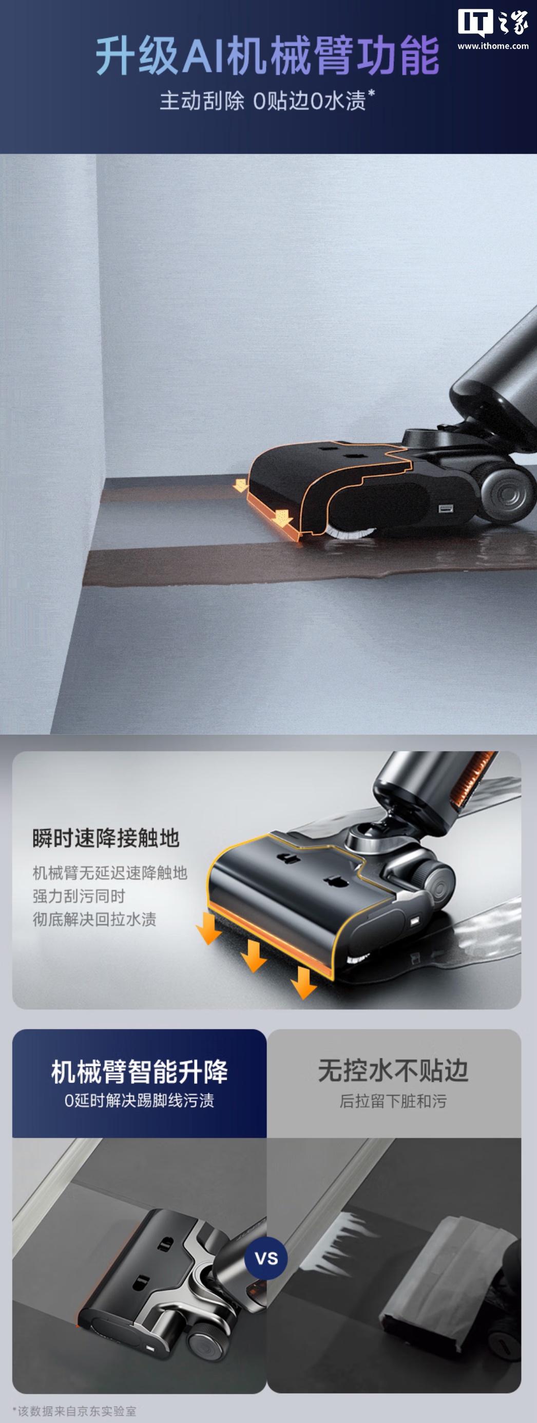 这款洗地机拥有 25000 Pa 吸力,升级机械臂结构,支持“智能升降”以清理踢脚线附近污渍。洗地机支持 100 度沸水洗和 120 度接触式熨烫烘干。