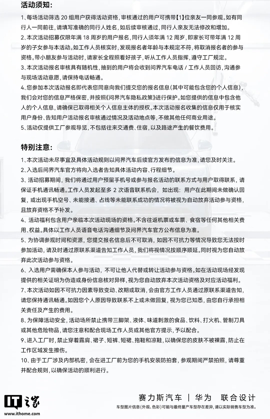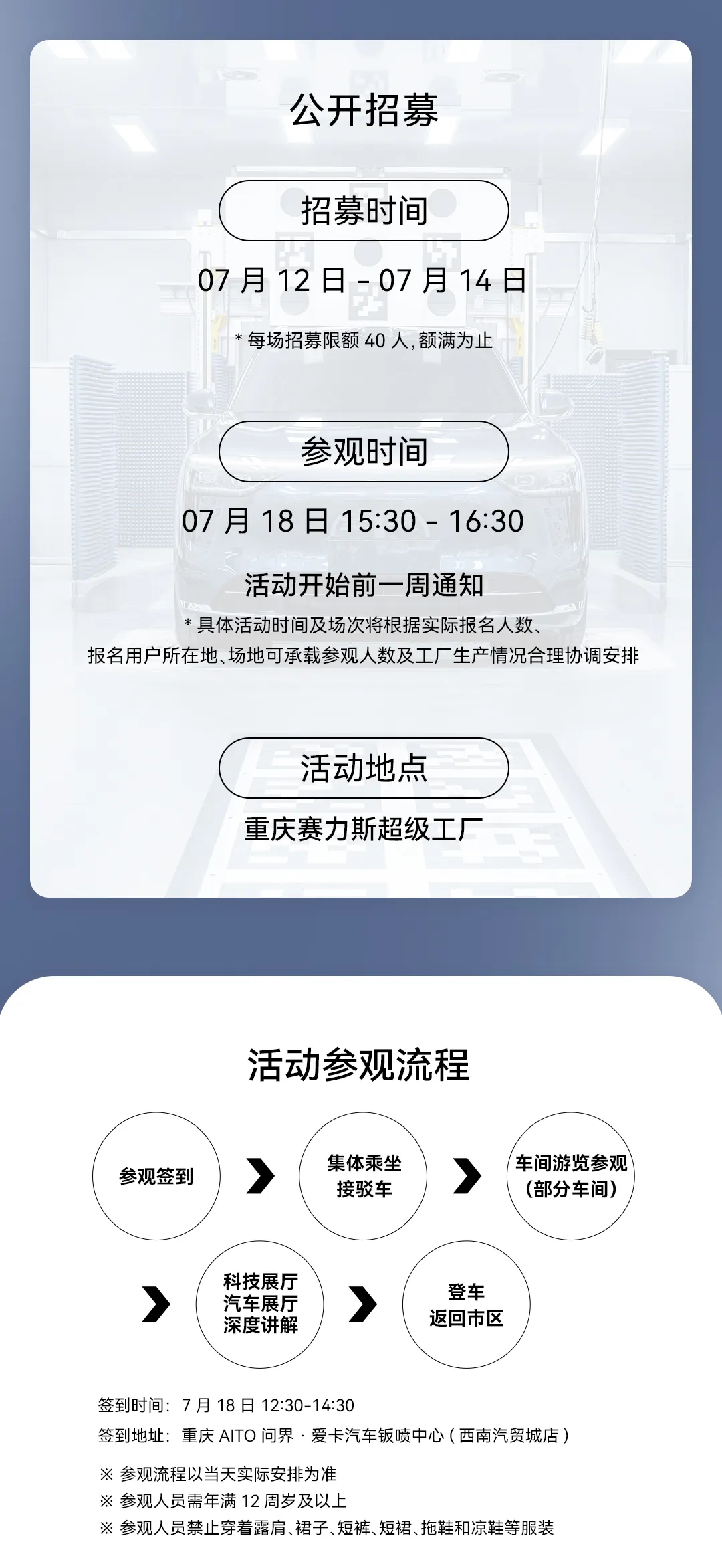 IT之家 7 月 12 日消息,问界汽车官方今日发文宣布:赛力斯超级工厂开放日今日起开启报名,将于 7 月 18 日开放参观,单场限 40 人(额满为止)。