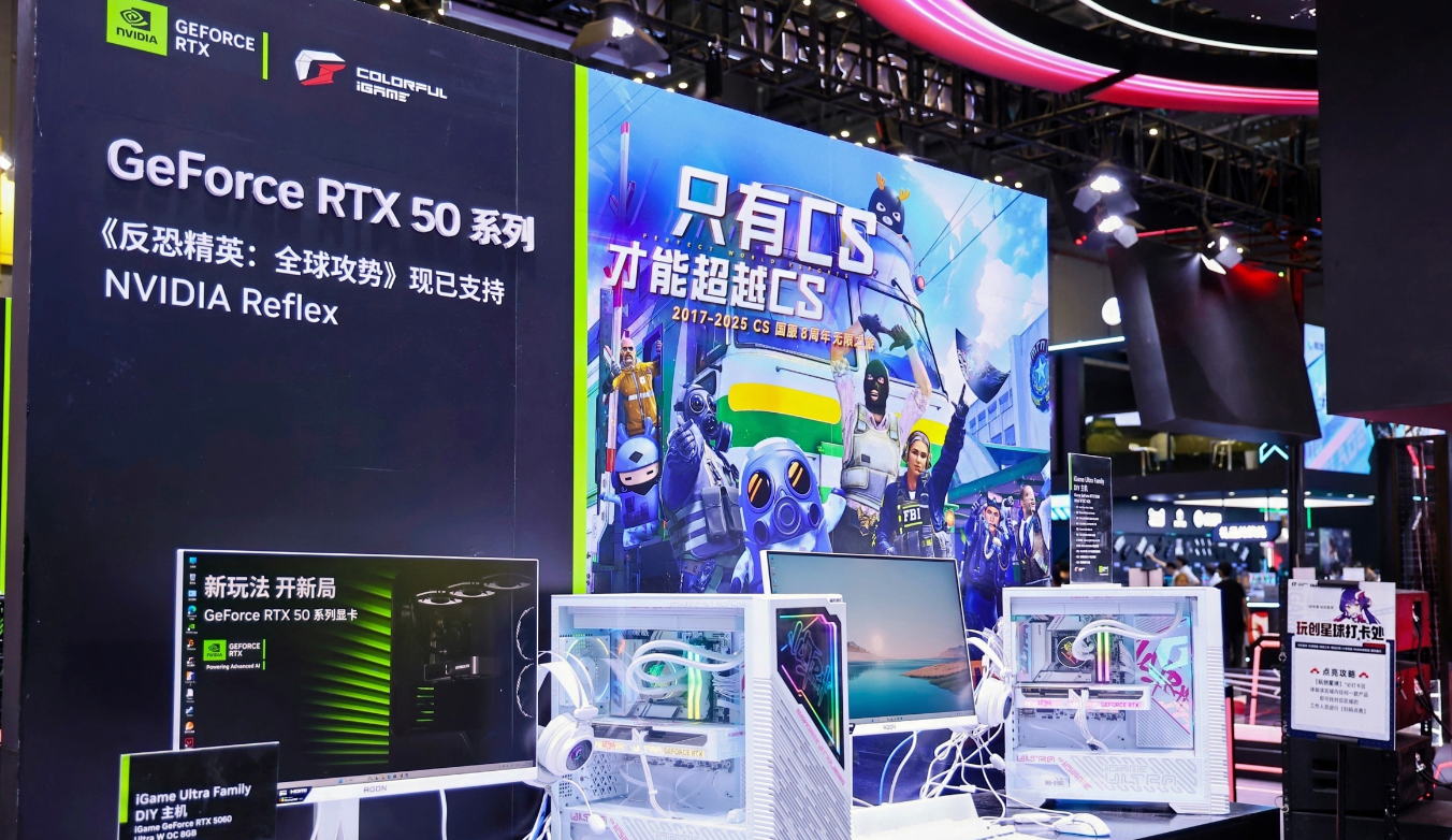 在技术体验方面,iGame GeForce RTX 超级玩家体验区展示了 Blackwell 架构显卡,四台主机搭载 RTX 5080/5070 Ti 显卡,运行《燕云十六声》等游戏时,DLSS4 技术将帧率提升至传统渲染的 3.9 倍;电竞区主机配备 RTX 5060 系列显卡,NVIDIA Reflex 技术降低 75% 延迟,搭配高刷显示器提升竞技体验。