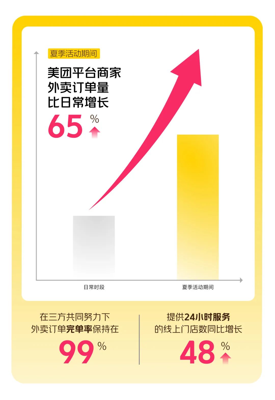 此外,美团计划 7 月底前在江苏、云南、辽宁、广东、山西等多地陆续揭牌 7 座“骑手之家”(面向全行业骑手免费开放,可提供服务包括休息补给、理发、换电、充电、室内游戏、订单咨询、跑单培训、安全培训等),其还为骑手提供全额置装补贴,包含防晒衣、雨衣、冰袖等,覆盖全国超 60 万骑手。餐饮商家们在美团也迎来更多客流,订单量比日常时段增长 65%,99% 的订单顺利完成并送到消费者手中,平均送达时间 34 分钟。