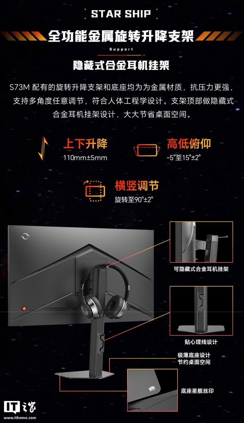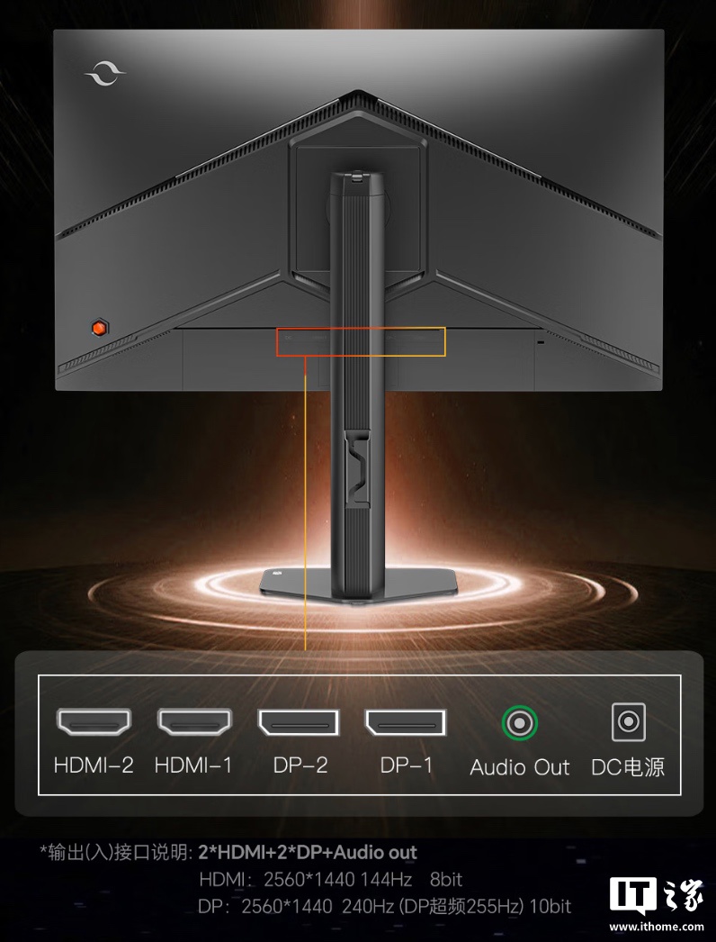 该机匹配小夜灯,支架支持升降 / 倾斜 / 旋转,显示器本体支持 VESA 100x100mm 壁挂,提供 2 个 HDMI 2.0(144Hz)、2 个 DP1.4(255Hz)、1 个 3.5mm 接口。