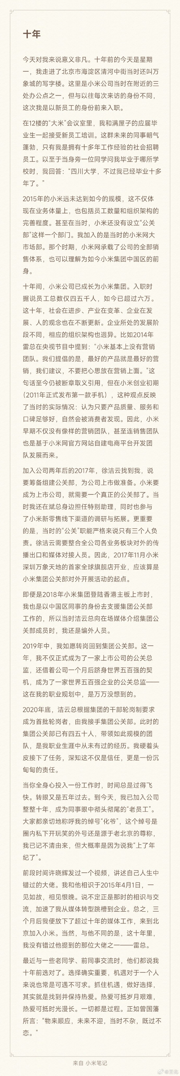 IT之家 7 月 13 日消息,今日,小米集团公关部总经理王化通过个人微博发布题为《十年》的长文,以亲历者视角回顾了小米公关体系十年来的演进历程,并披露其从“社会招聘员工”成长为部门掌舵者的职业轨迹。小米创办人、董事长兼 CEO 雷军回应该微博称:“时间过得好快,转眼十年了,谢谢这十年辛苦的工作和贡献。”