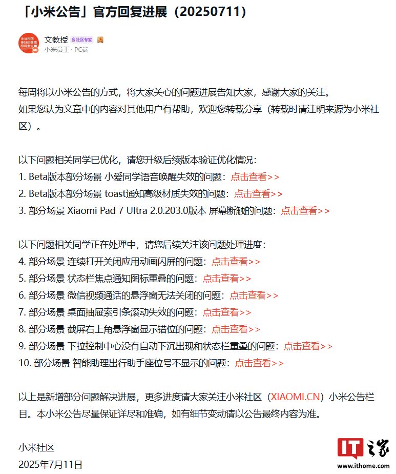 IT之家 7 月 13 日消息,小米员工本周(7 月 11 日)在小米社区发布公告,对小米澎湃 HyperOS 问题处理进展进行公布,其中提到了小米 Pad 7 Ultra 平板的体验问题优化情况。