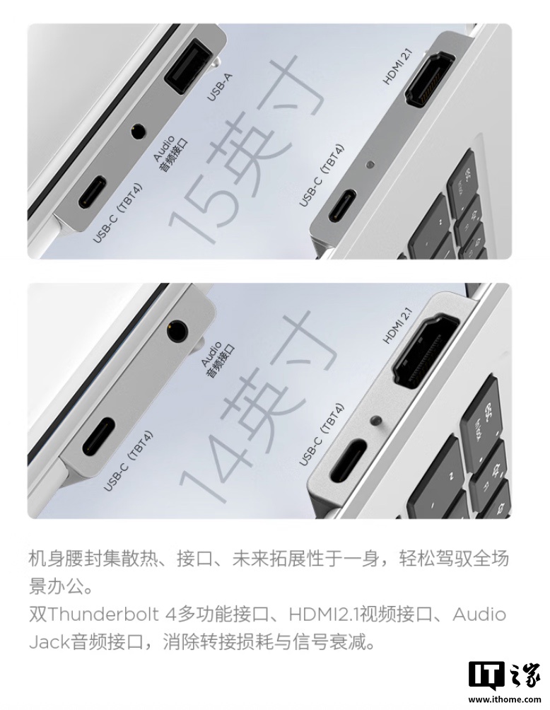 两款机型均支持 Wi-Fi 7 和蓝牙 5.4 技术,匹配 2 个雷电 4 接口、1 个 HDMI 2.1 接口、1 个 3.5mm 音频接口、1 个 USB-A 接口(该接口仅 15 英寸)。