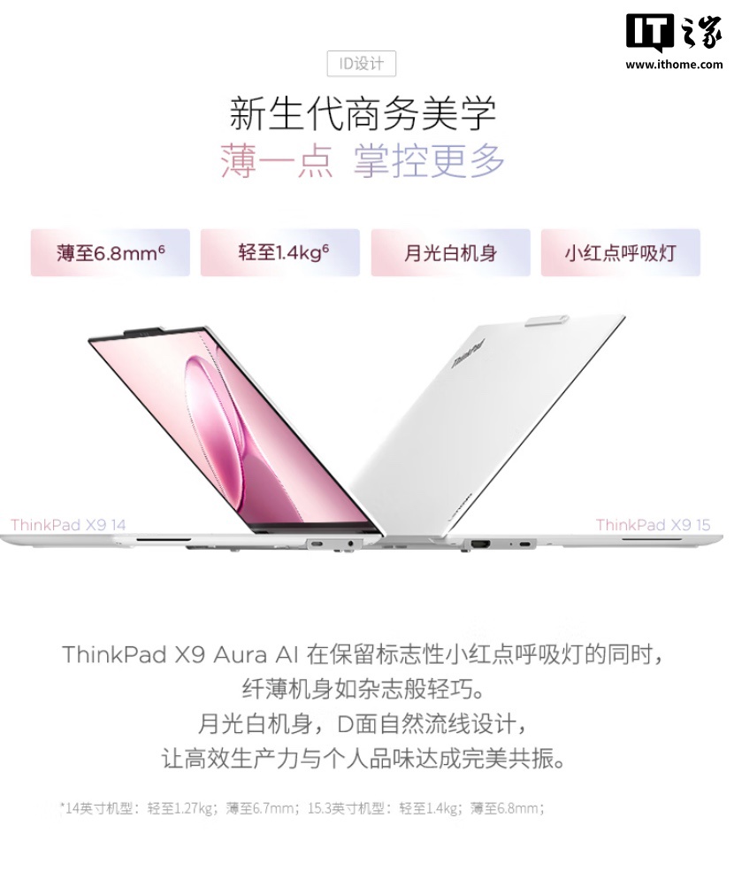 IT之家 7 月 13 日消息,联想旗下 ThinkPad X9 14/15 Aura AI 2025 元启版新增的“月光白”配色版本将于明天 0 点开启首销,定价为 12999 元起,IT之家整理规格如下: