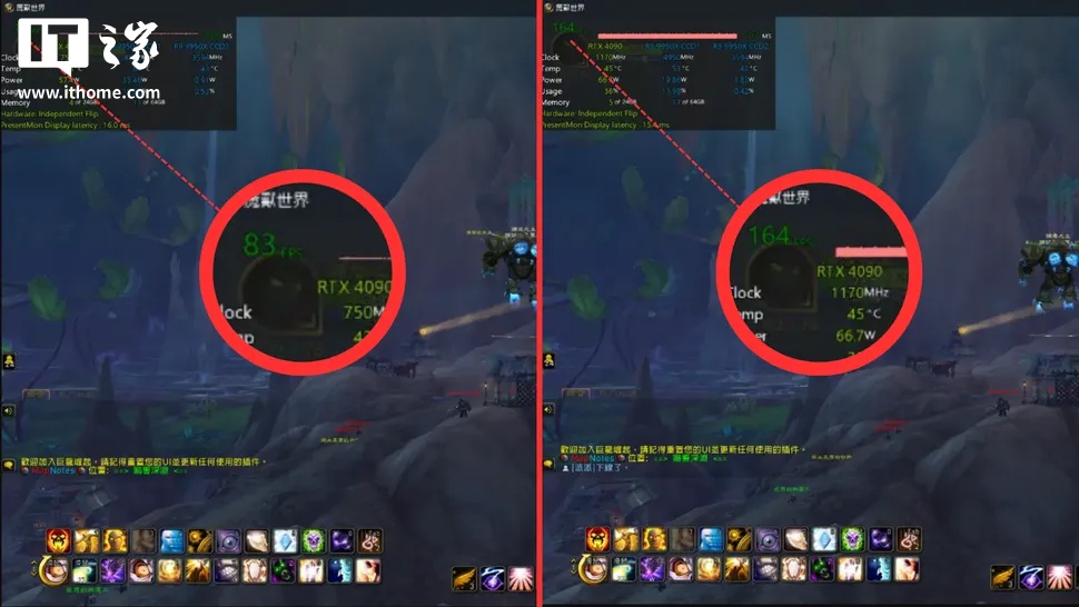 在启用该功能后,《魔兽世界》中的帧率从 82 FPS 立即提升至 164 FPS,且没有增加任何额外的延迟。《魔兽世界》本身并不支持 DLSS,因此这是一次实质性提升。其他用户也报告称,在多个不同的游戏中获得了类似的帧率提升。