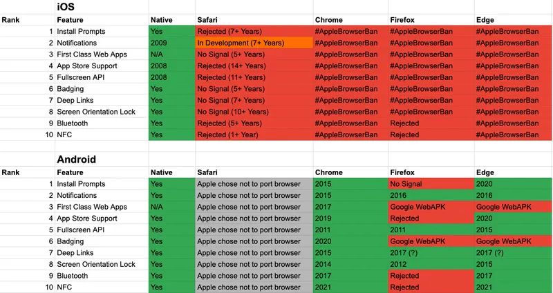 OWA 指责苹果公司故意设置技术、法律、市场和实际障碍,阻碍开发者推行自家浏览器,在报告中,OWA 明确指出了苹果施加的 4 种障碍: