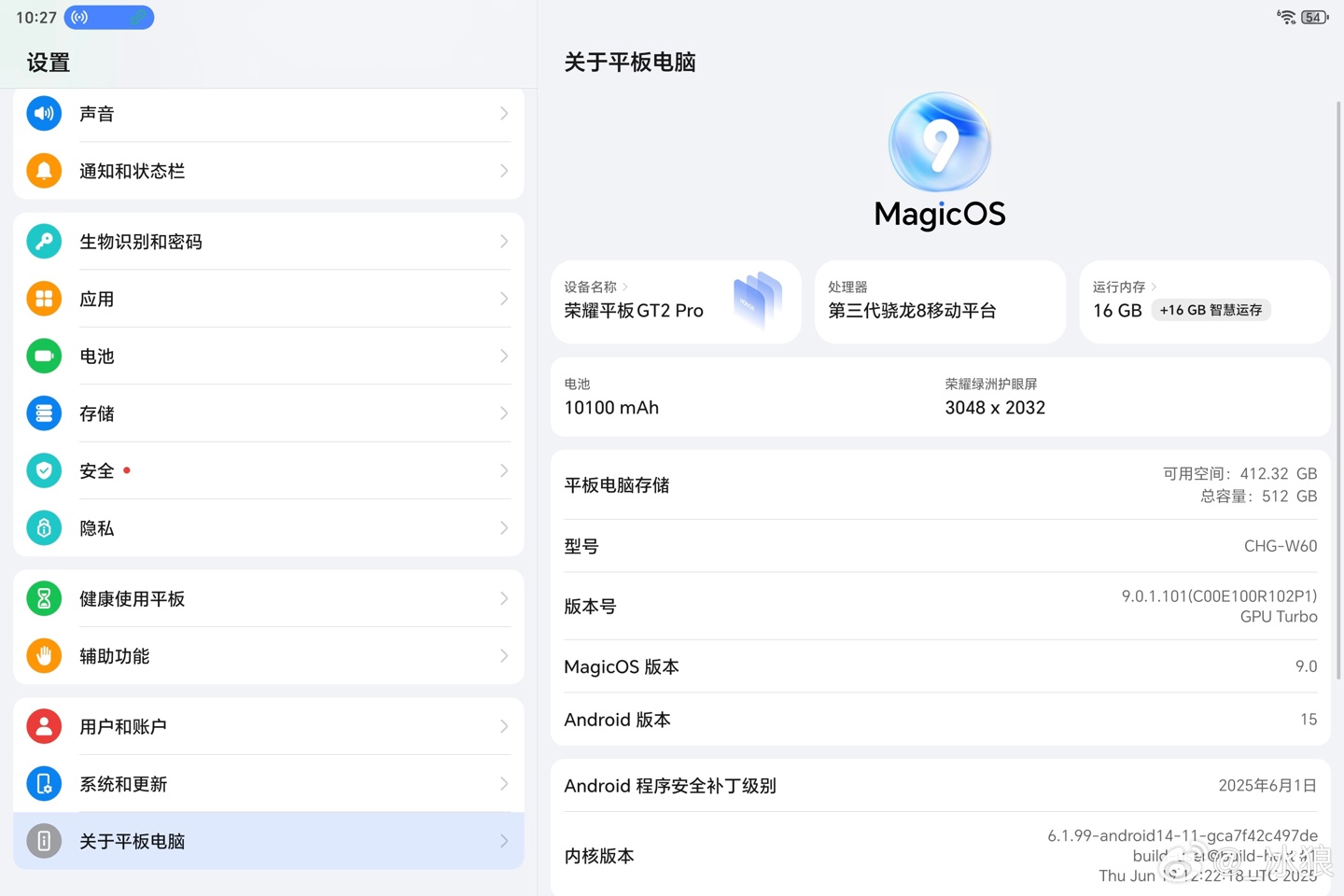 根据该名用户的分享,荣耀平板 GT2 Pro 型号为“CHG-W60”,将搭载第三代骁龙 8 移动平台,提供 16GB+512GB 存储规格(支持 16GB 智慧运存),配备一块分辨率为 3048×2032 的绿洲护眼屏,内置 10100mAh 电池,预装 MagicOS 9.0.1.101 版本系统。