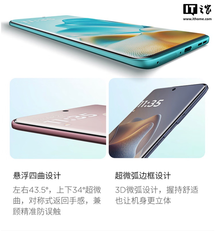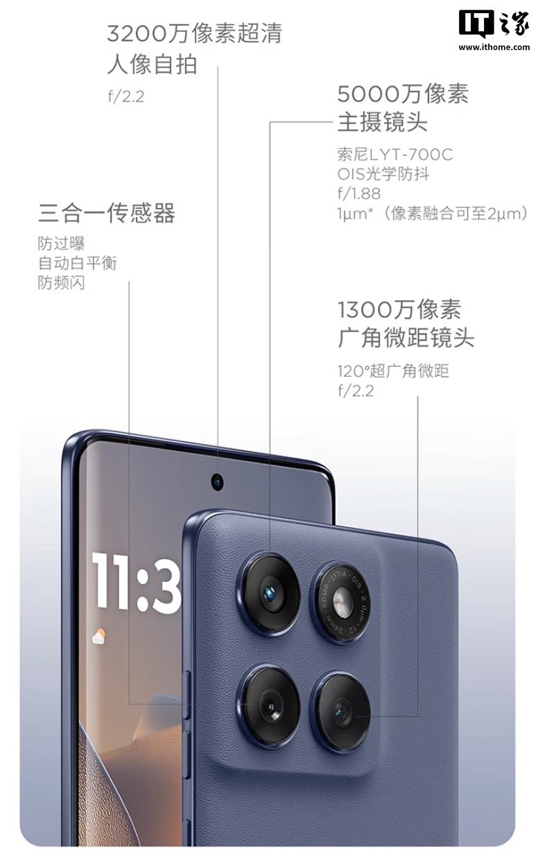 该机配备一块 6.7 英寸 2712×1220 像素 120Hz 四曲面 p-OLED 屏幕(亮度至高 4500 尼特),匹配 32MP 自拍摄像头。目前这款“夏日乌梅”配色使用 moto 空气纳米皮,提供卵石皮革纹理。手机后置 50MP 主摄 + 13MP 广角微距 + 三合一传感器。