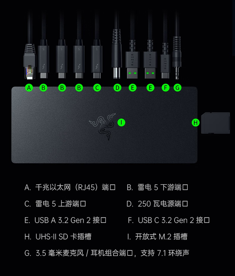 10 端口拓展:雷电 5、千兆网口、3.5mm 音频接口、UHS-IISD 读卡器、USB-A 3.2 Gen 2 接口、M.2 存储插槽