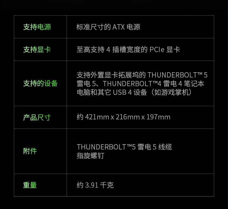 采用新一代雷电 5 接口,兼容 PCle 接口的 NVIDIA 和 AMD 全尺寸显卡;