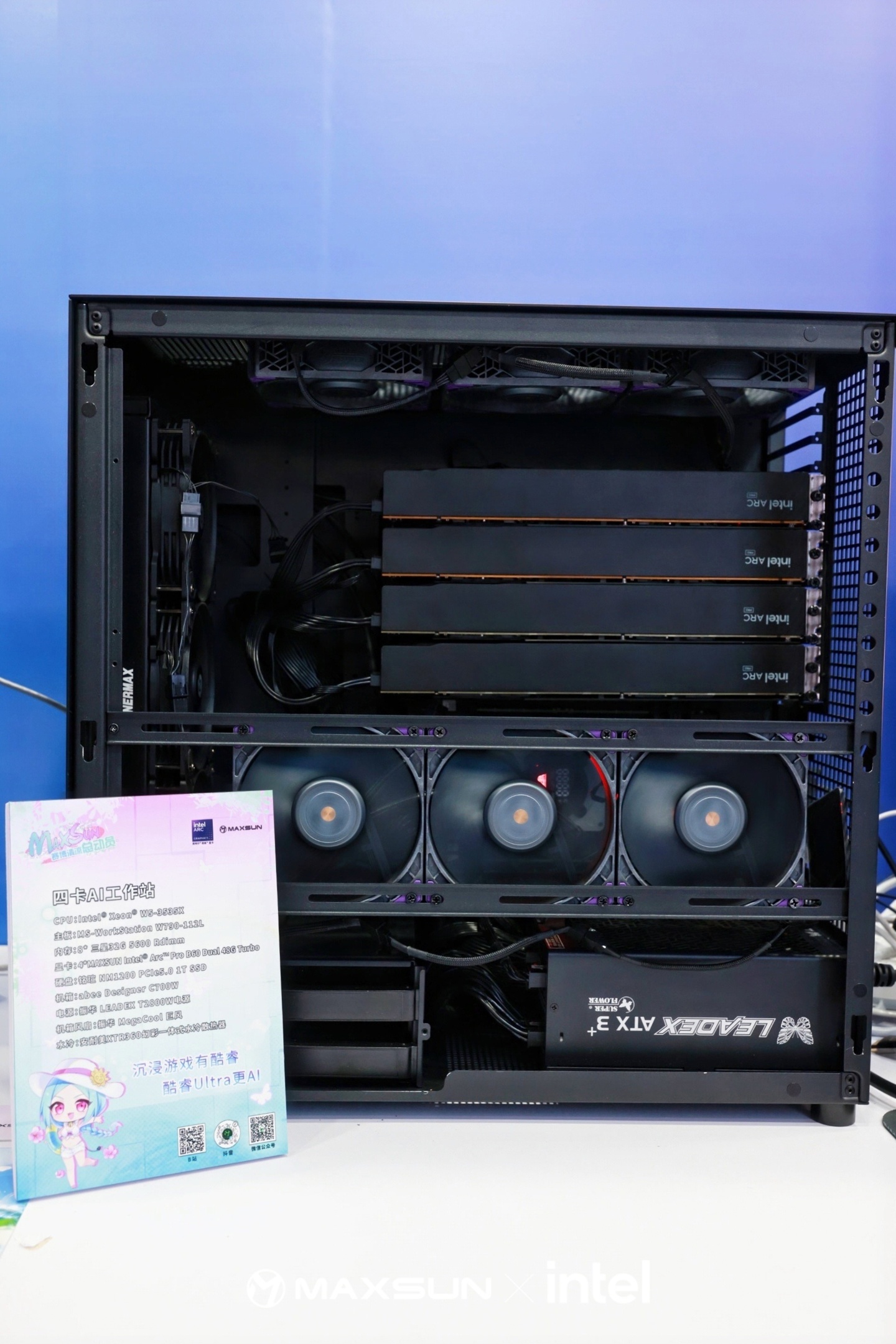 而在关键的显卡方面,该平台搭载了四张铭瑄的英特尔锐炫 Pro B60 Dual 48GB Turbo 双芯双宽卡,一共提供 192GB 显存容量。