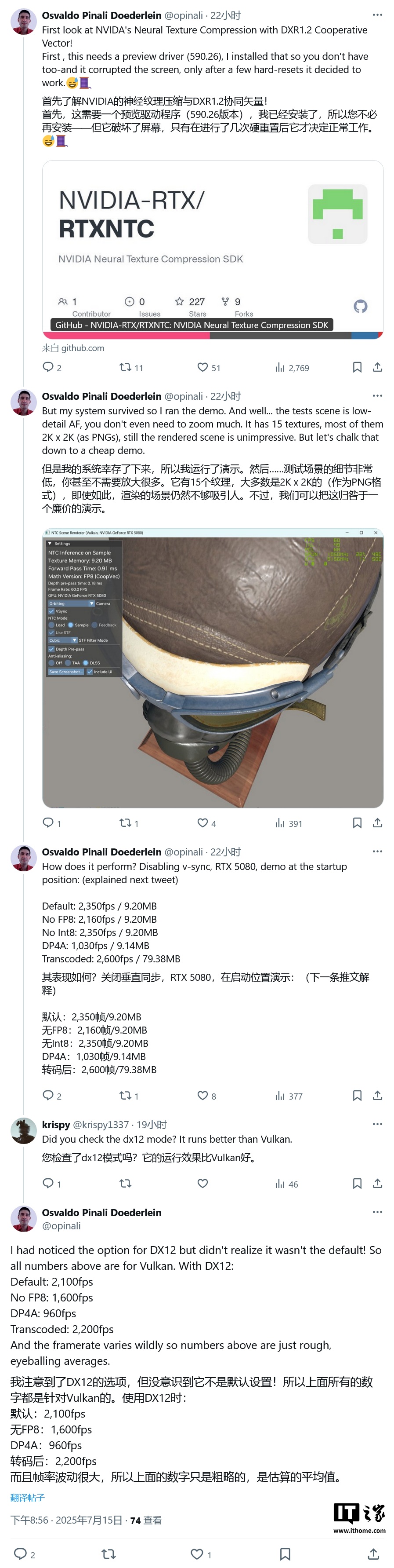 测试显示,在“默认”模式下启用合作向量和 NTC,纹理渲染帧率可达 2350 FPS;而完全禁用时(DP4A),渲染性能下降至 1030 FPS,相差近 80%。