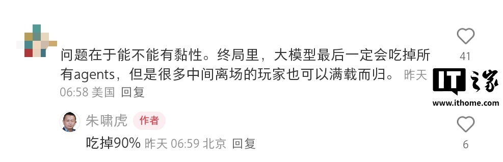 IT之家 7 月 16 日消息,金沙江创投主管合伙人朱啸虎在小红书上回复网友时表示,大模型会吃掉 90% Agent(智能体)。