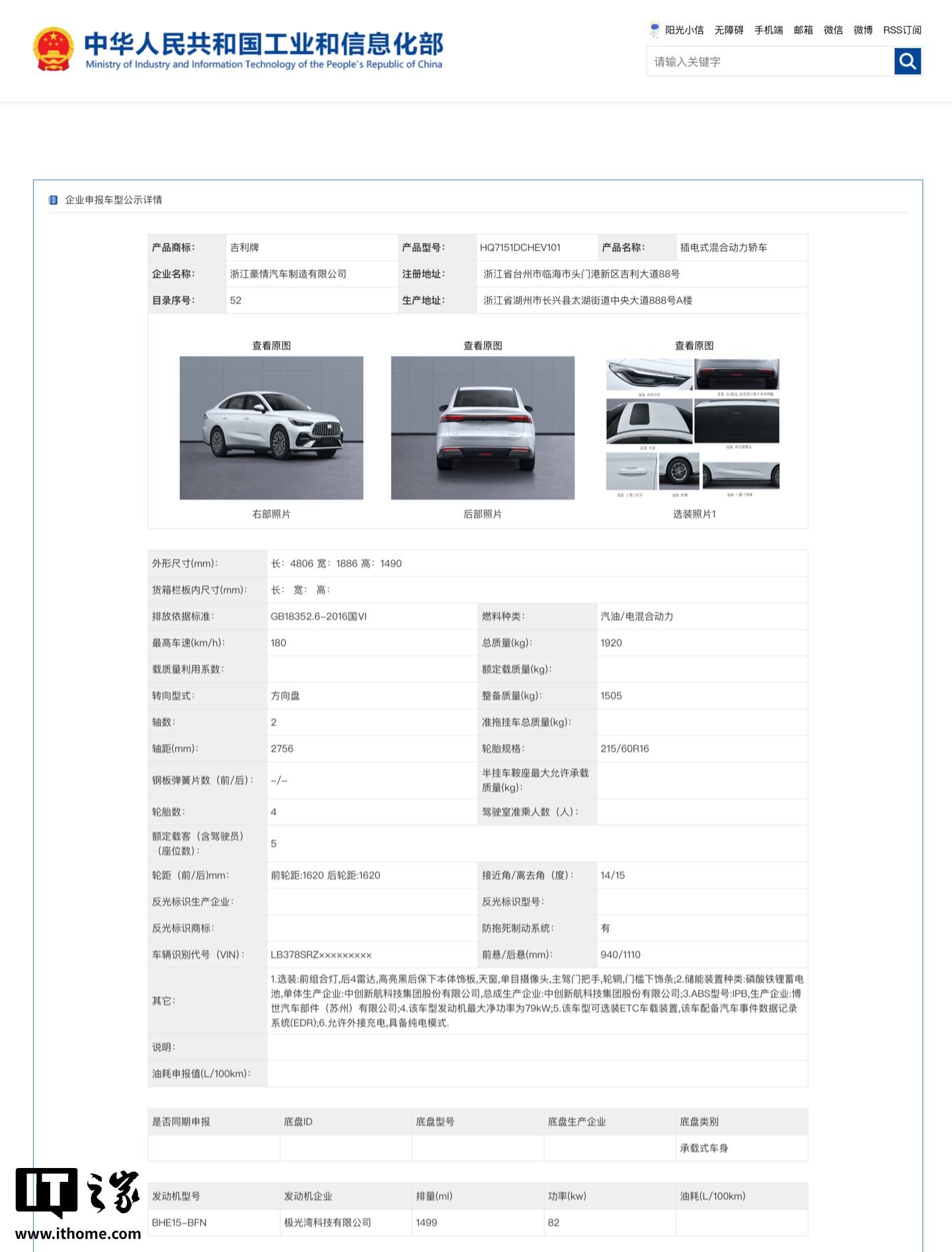 IT之家 7 月 16 日消息,工信部今天发布了第 397 批《道路机动车辆生产企业及产品公告》,IT之家从其中发现了吉利全新车型 —— 银河系列的插混轿车星耀 6。