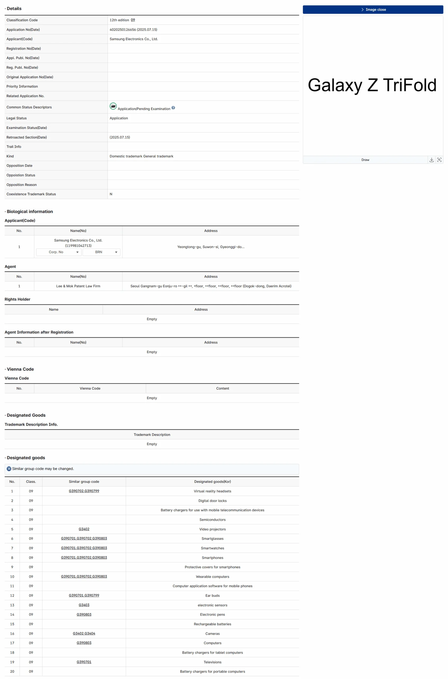 IT之家 7 月 17 日消息,据 GalaxyClub 报道,三星已在韩国申请注册了“Galaxy Z TriFold”的商标。这一名称直译为“Galaxy Z 三折叠”,从字面上看,似乎与三星首款三折叠手机的特性十分契合,但业内人士对其是否最终成为该手机的正式名称持保留态度。