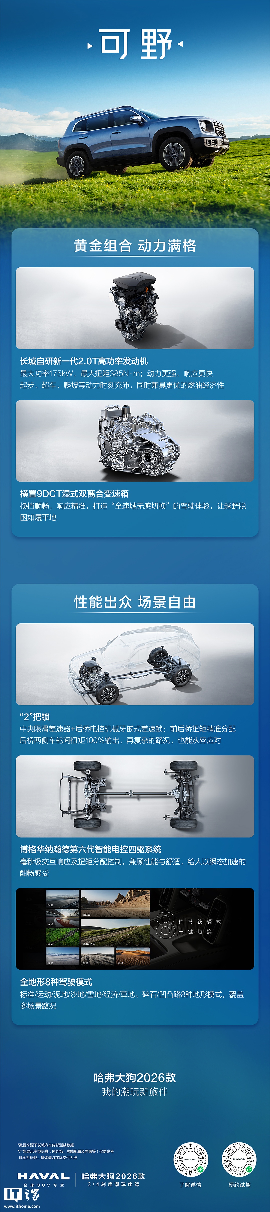 动力方面,2026 款哈弗大狗依然提供 1.5T 发动机 + 7 速湿式双离合变速箱和 2.0T 发动机 + 9 速湿式双离合变速箱两种动力总成。其中,1.5T 发动机最大功率为 184 马力,2.0T 发动机最大功率为 238 马力。2.0T 车型依旧配备四驱系统,并升级为第六代智能电控四驱,拥有中央差速锁和后桥电控机械式牙嵌差速锁,可提供 8 种驾驶模式,能够应对各种复杂路况。