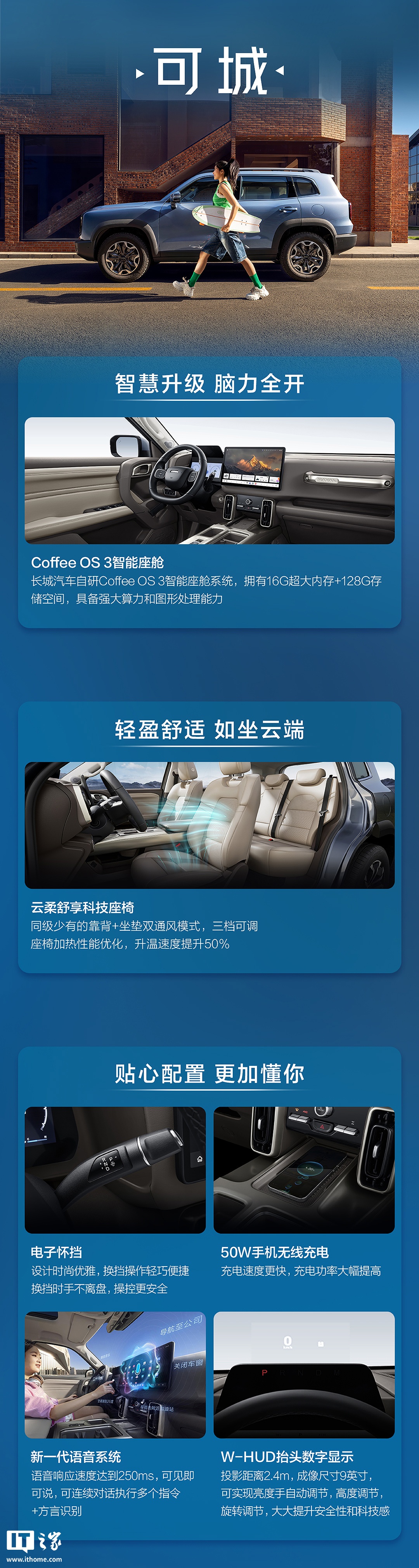进入车内,2026 款哈弗大狗的内饰设计焕然一新。方向盘采用双辐式设计搭配平底造型。怀挡设计的加入,使得中央岛台区域拥有更丰富的储物空间。内饰配色方面,新车提供了玄武黑、雾凇灰、沙丘米三种选择。最大的变化是升级为 14.6 英寸中控屏,其内置最新一代 Coffee OS 3 智能座舱系统,支持主流手机品牌一键投屏、高德地图(新增红绿灯倒计时、绿波车速提醒、盲区会车预警等实用便捷功能)、网易云音乐、优酷等常用 App。同时,智能语音系统也进行了升级,支持超过 70 项功能的语音控制,智能化表现大幅提升。此外,新车还配备了云柔舒享科技座椅,优化了座椅曲线,采用四层结构设计,承托感更强。配置上,支持前排座椅电动调节、加热、通风功能,还有前排 50W 无线快充、新风系统、HUD 抬头显示以及 10 扬声器音响(可选装升级爱情之音品牌)等。