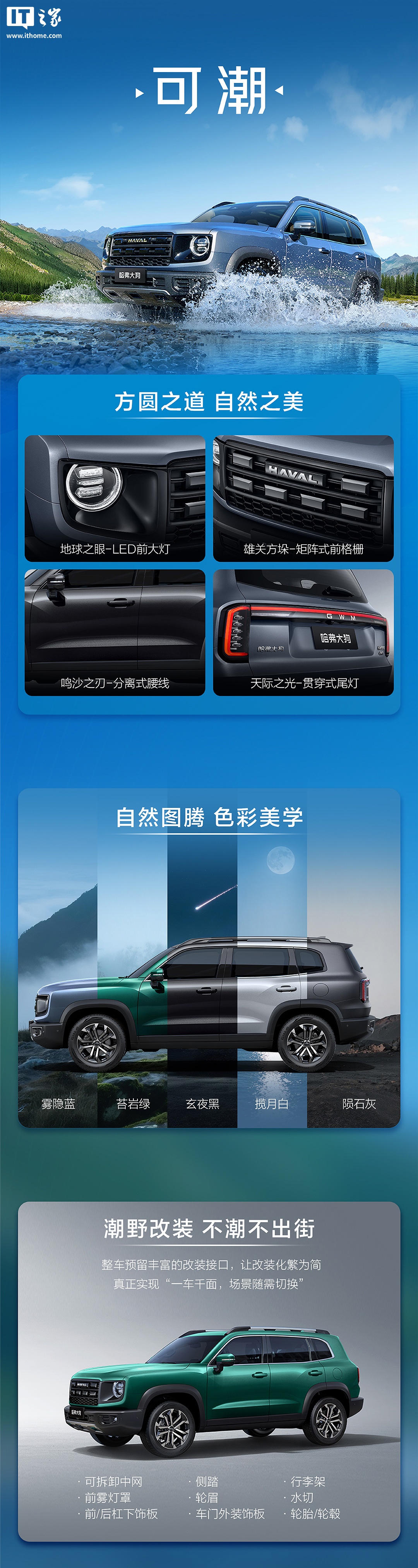 车身侧面和车尾延续了老款车型的设计风格,只是将贯穿式尾灯组上的品牌 LOGO 由“HAVAL”更换为“GWM”,整体造型依然保持了硬朗与时尚的结合。车身尺寸未变,长宽高分别为 4620/1890/1780mm,轴距为 2738mm。值得一提的是,新车的中网、前后包围、轮眉以及行李架等饰件支持 DIY 改装,进一步提升了车辆的可玩性。