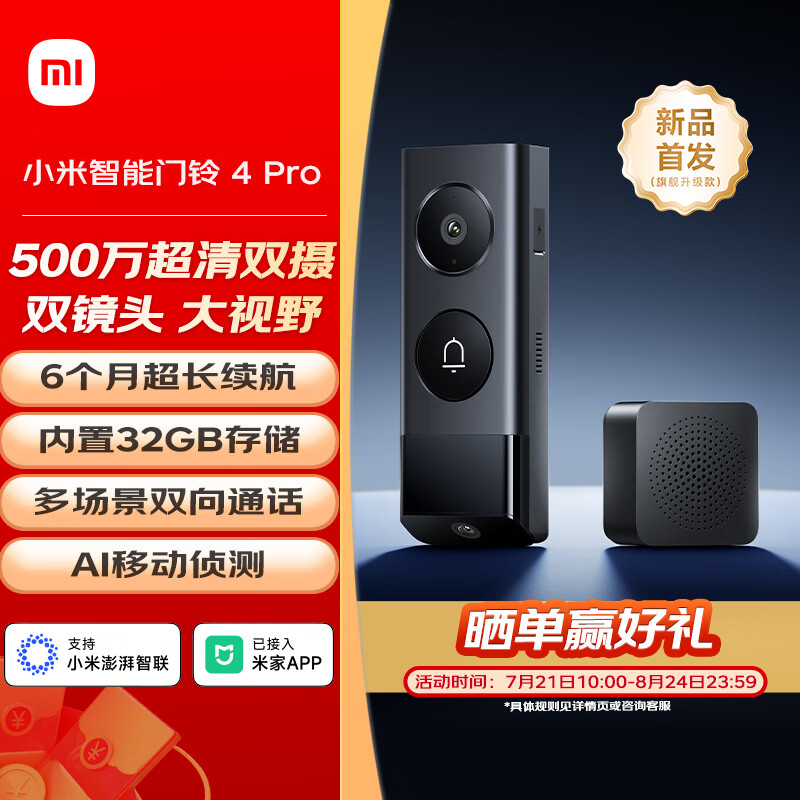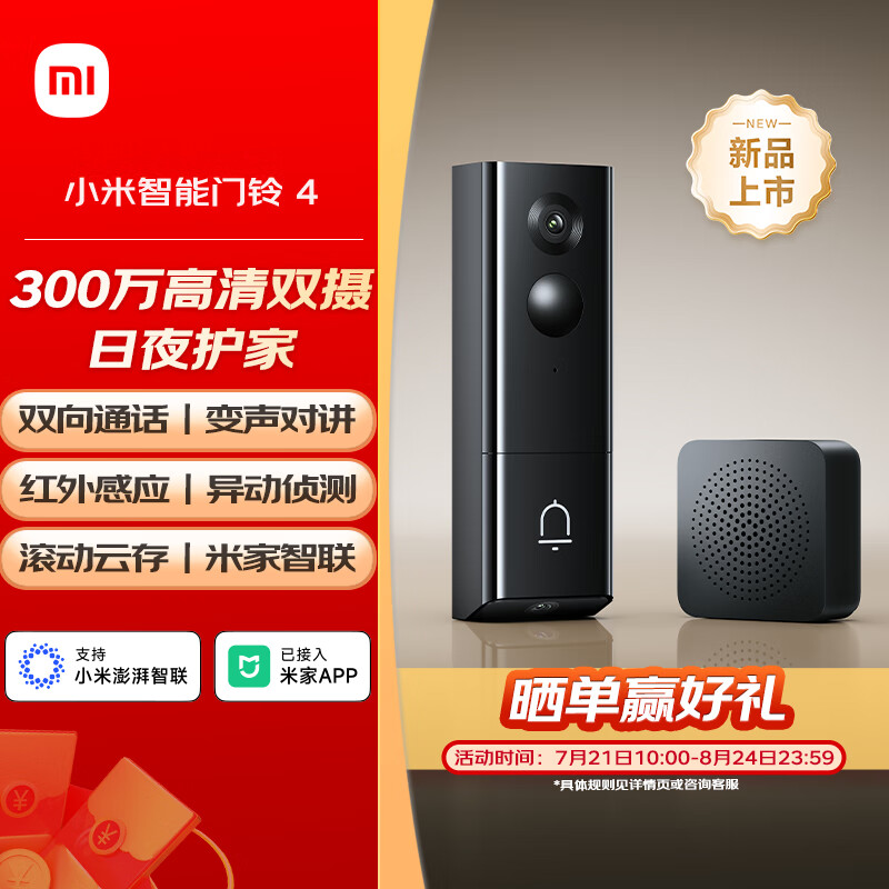 IT之家 7 月 18 日消息,小米智能门铃 4、4 Pro 现已上架京东等平台并开启预约,售价分别为 299 元和 499 元,将于 7 月 21 日 10:00 开售。