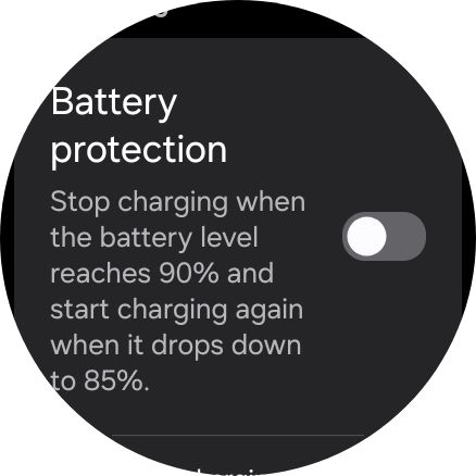 而在 Galaxy Watch8 系列中,三星引入了“电池保护”选项,其描述为:“在电量达到 90% 后停止充电,在电量低于 85% 后重新开始充电”。