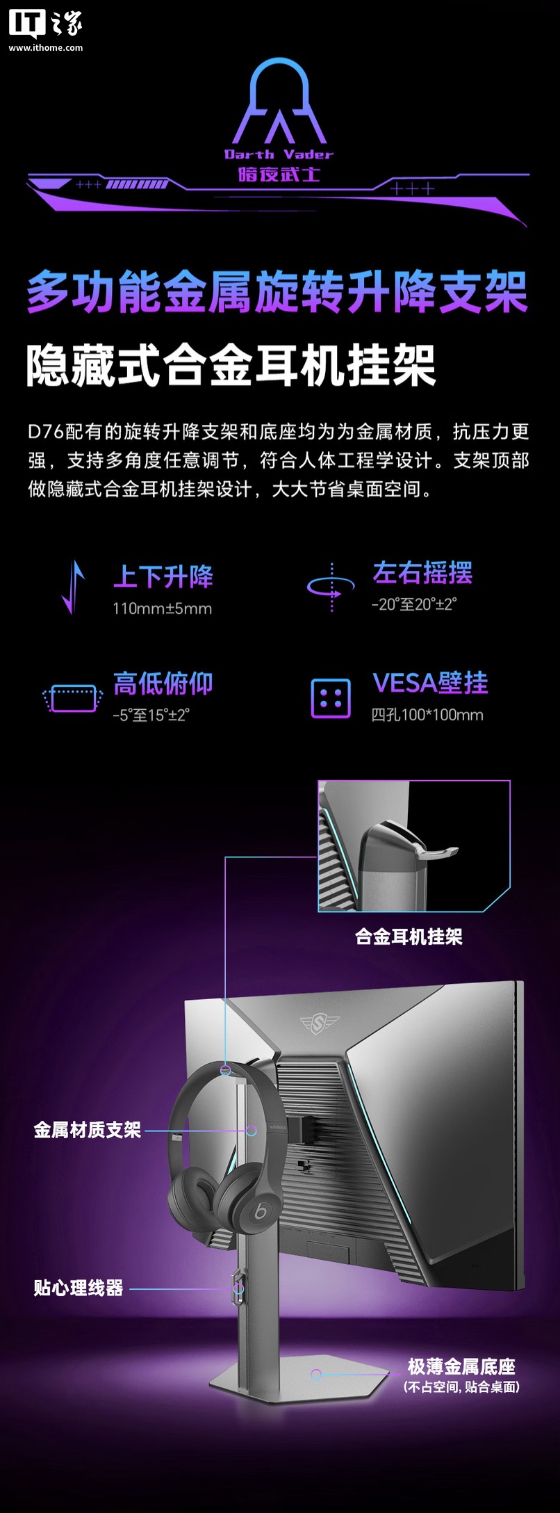 该机支架支持升降 / 倾斜 / 旋转,同时提供耳机挂架,显示器本体带有光效,支持 VESA 100x100mm 壁挂,提供 2 个 HDMI 2.1(320Hz)、2 个 DP 1.4(360Hz)、1 个 3.5mm 音频接口。