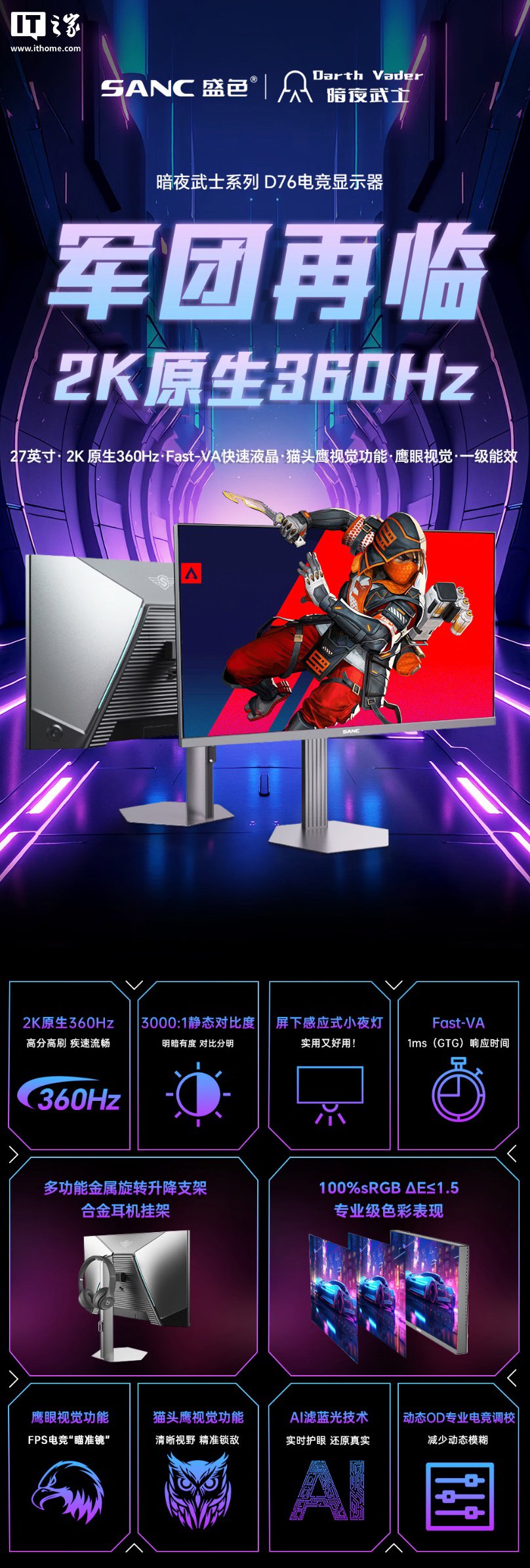 IT之家 7 月 18 日消息,盛色现已在京东上架一款型号为 D76 的 27 英寸显示器,该机主打“2K 360Hz”,定价为 1999 元,部分地区国补后到手价 1690.66 元。