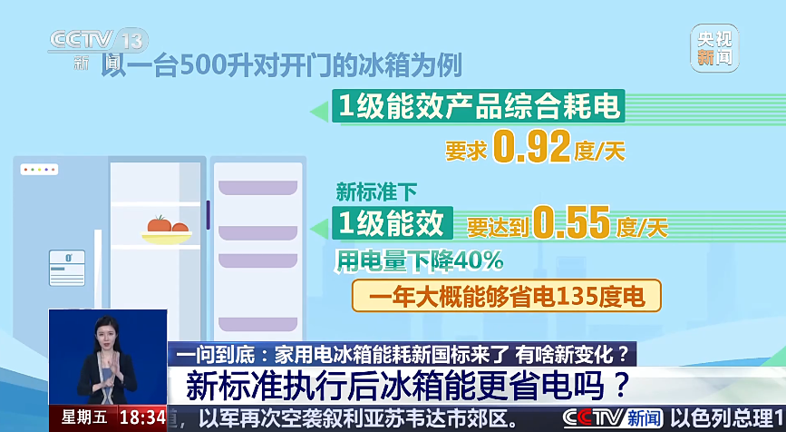 以一台 500 升对开门的冰箱为例,目前,1 级能效产品综合耗电要求 0.92 度 / 天,新标准下,1 级能效要达到 0.55 度 / 天,用电量下降 40%,一年大概能够省电 135 度电,节省电费 68 元左右。