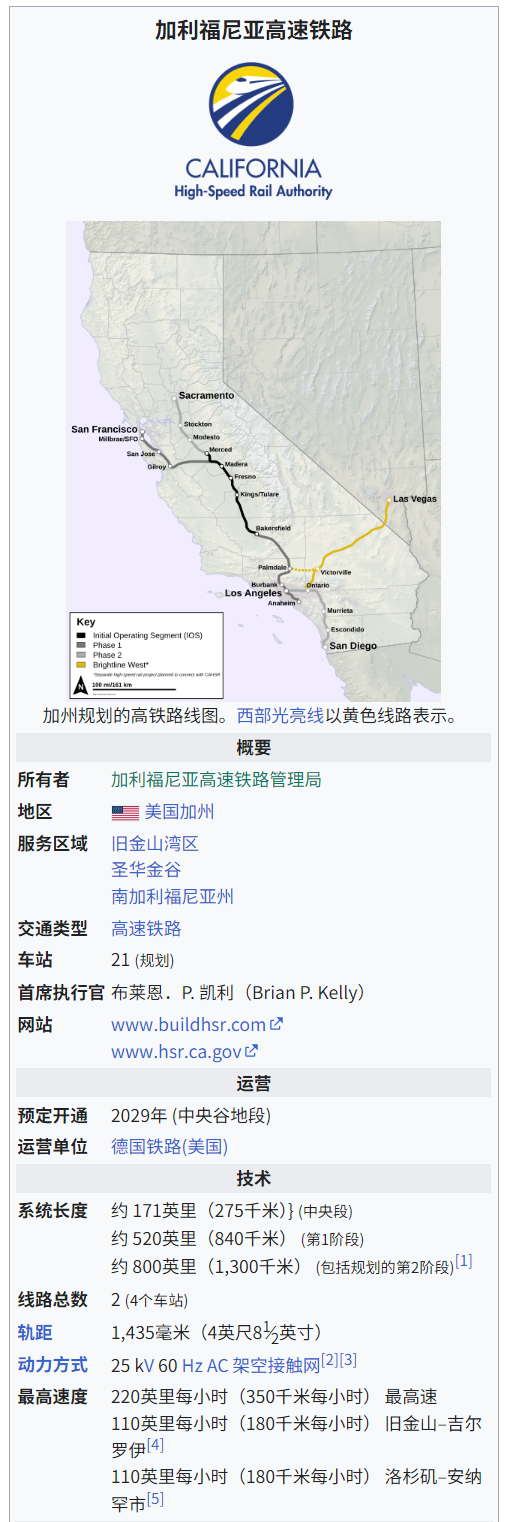 IT之家查询公开资料获悉,加利福尼亚高速铁路(California High-Speed Rail)是美国加州兴建中的高速铁路系统,全线行车速度设计为最高可达 350 km/h,高速铁路系统一期工程竣工后,将在三小时内从旧金山直达洛杉矶盆地。该系统最终将延伸至萨克拉门托和圣地亚哥,全长 800 英里(约 1287 公里),最多设有 24 个车站。