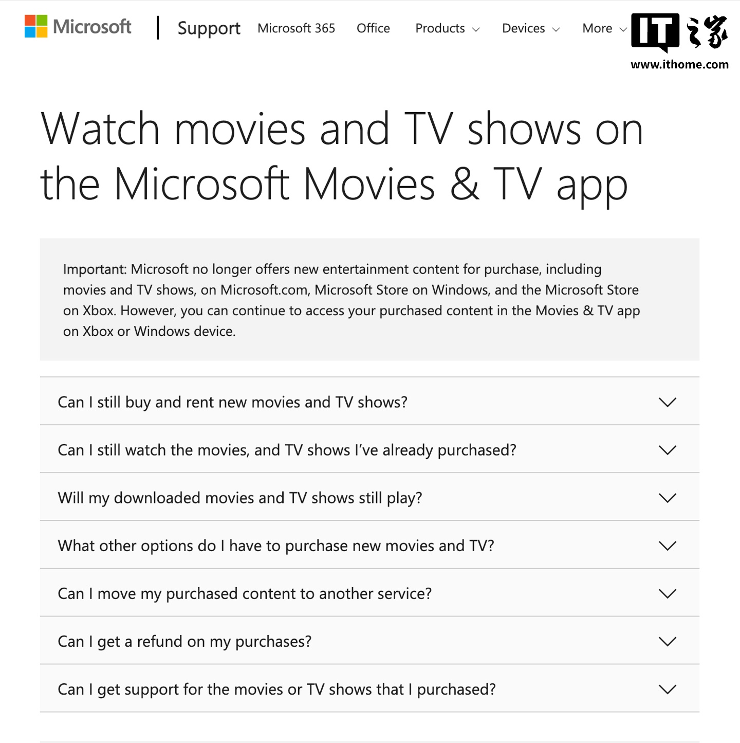用户先前已购买的内容依然可以访问并播放。在常见问题解答部分,微软进一步澄清了有关关闭的几个问题。用户可以在 Windows PC 和 Xbox 控制台上使用“电影与电视”应用播放已购买的电影和电视节目。