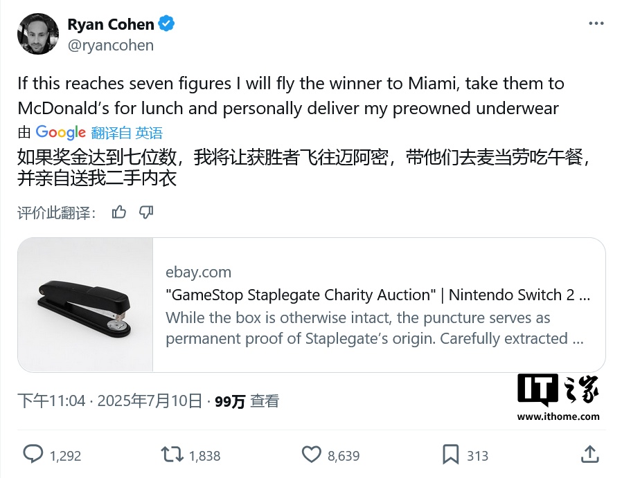 有趣的是,GameStop 将这次失误转化为一次成功的公关案例,决定将这台订书机与一台新的 Switch 2 一起拍卖,并将所得款项捐给儿童奇迹网络医院,最后成交价格为 25 万美元。