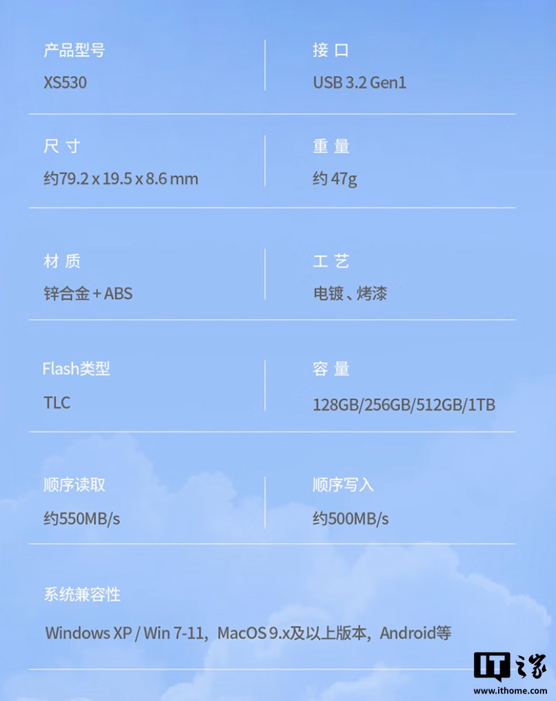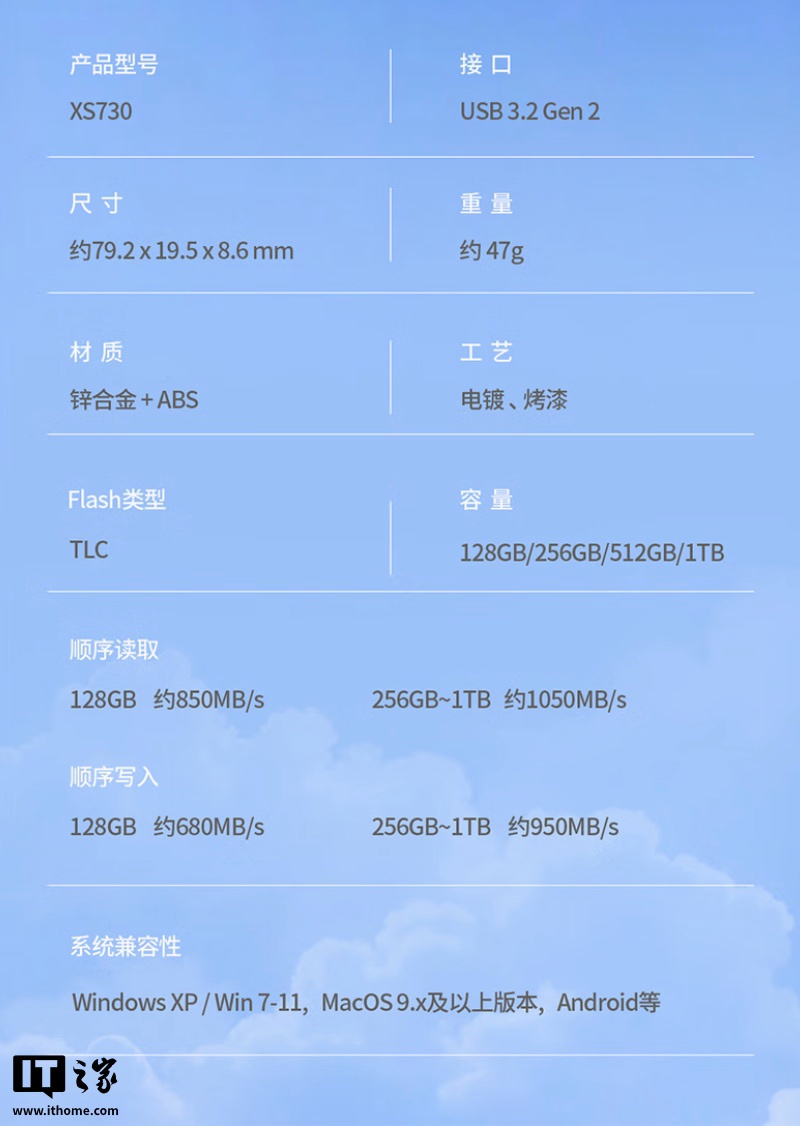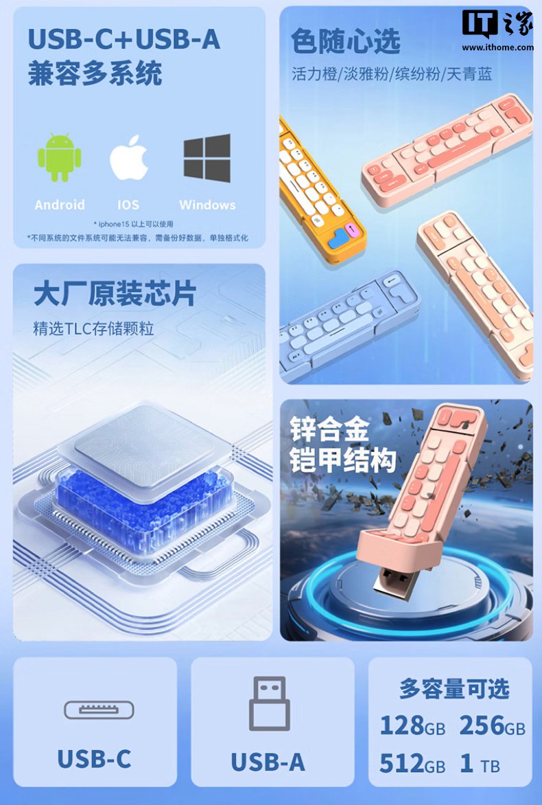 据介绍,系列 U 盘可选活力橙、缤纷粉、天青蓝配色,U 盘壳体采用锌合金结构,提供 USB-C / A 双口可选,虽然官方将系列 U 盘标注为“传输速度 550MB/s”和“传输速度 1050MB/s”两种版本,但实际上两种版本中的不同存储规格实际读速有所区别,IT之家附相应 U 盘参数如下: