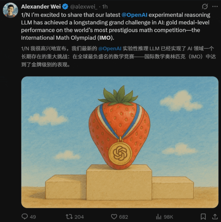 然而,就在刚刚,OpenAI 投下了一枚重磅炸弹 —— 他们用一款全新的「通用推理模型」,成功夺下了 IMO 2025 的金牌!
