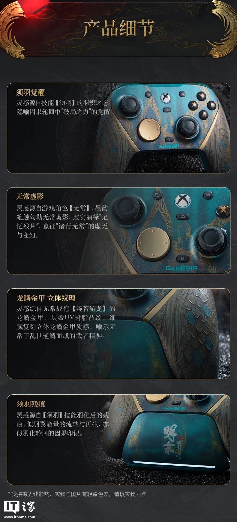 在外观整体设计上,这款手柄汲取《明末:渊虚之羽》游戏特色元素,以无常战袍【婉若游龙】为灵感,将“因果轮回”、“虚无”、“无常破局”等寓意具象化。