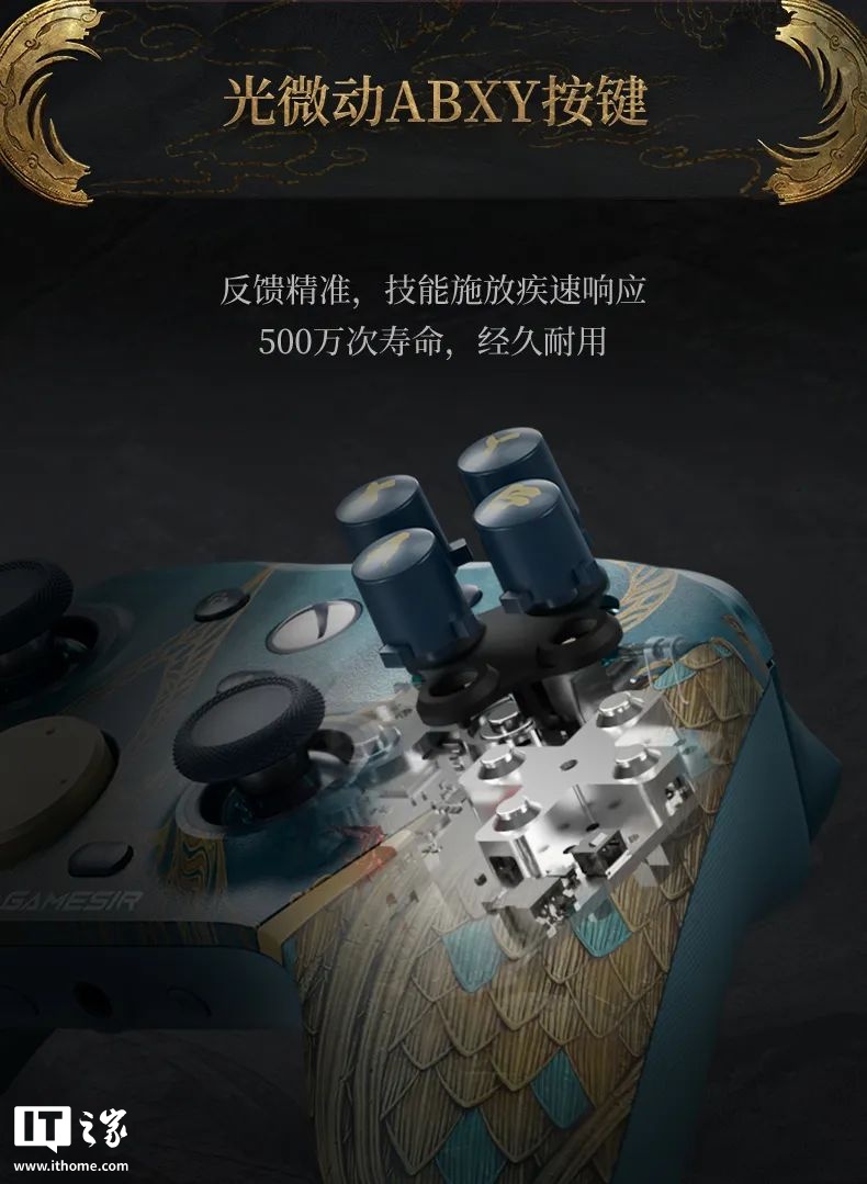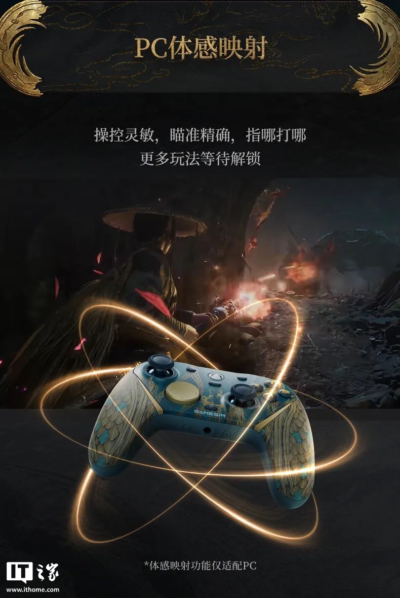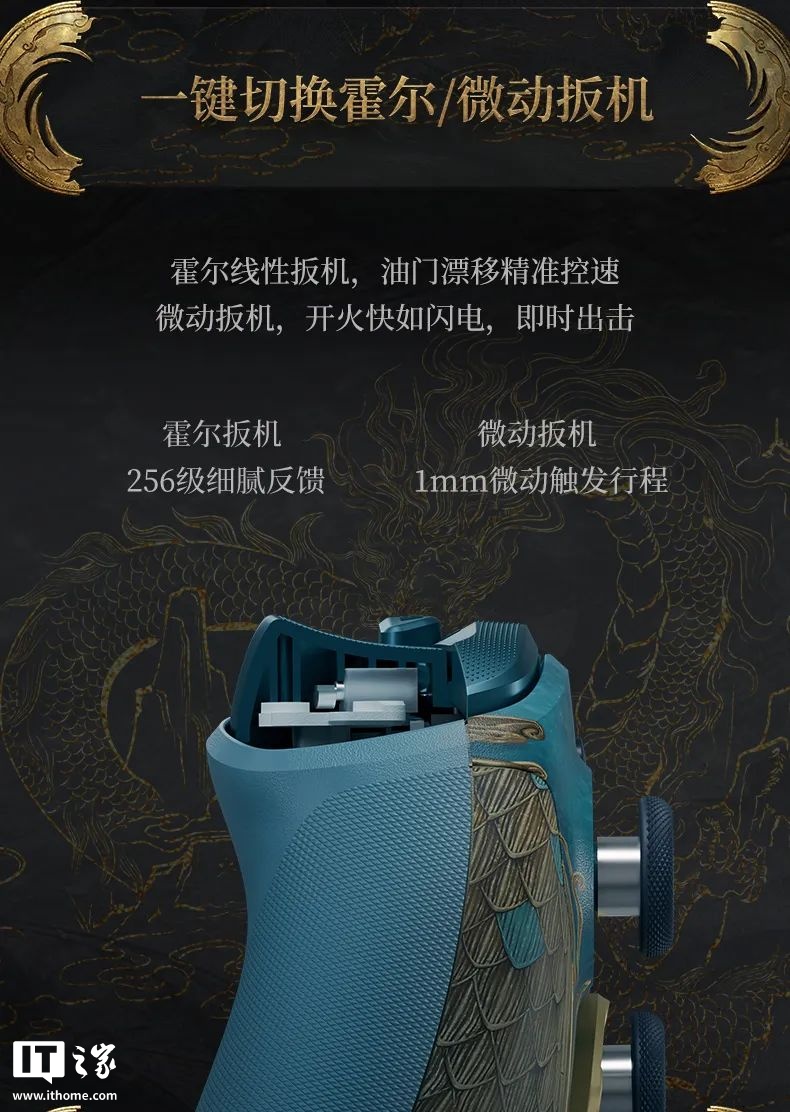 该手柄还支持一键切换霍尔 / 微动扳机,采用双微动小肩键 + 双背键拓展键、光微动 ABXY 键,还支持 PC 体感映射功能。