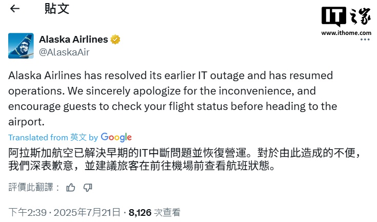 该公告发出于美东时间 7 月 20 日晚上 21 点(IT之家注:北京时间 7 月 21 日上午 9 点),同时阿拉斯加航空也在 X 平台宣布了以下信息: