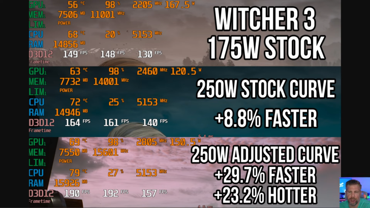 GizmoSlipTech 指出,要实现这一性能提升,必须将显卡的默认功率曲线调整到更高的瓦数级别,否则提升效果将微乎其微。在具体游戏测试中,例如《黑神话:悟空》的性能提升达到了 23.3%,而《赛博朋克 2077》的性能提升则为 21.7%。