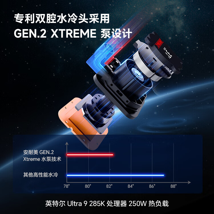 LIQMAX IV ARGB 所搭载的 ENERMAX Gen.2 Xtreme 水泵采用双腔体冷热分离结构,流量提升 31%、铜底面积扩大 35%,冷却 250W 功耗的英特尔酷睿 Ultra 9 285K 时处理器温度可多降低 5℃。