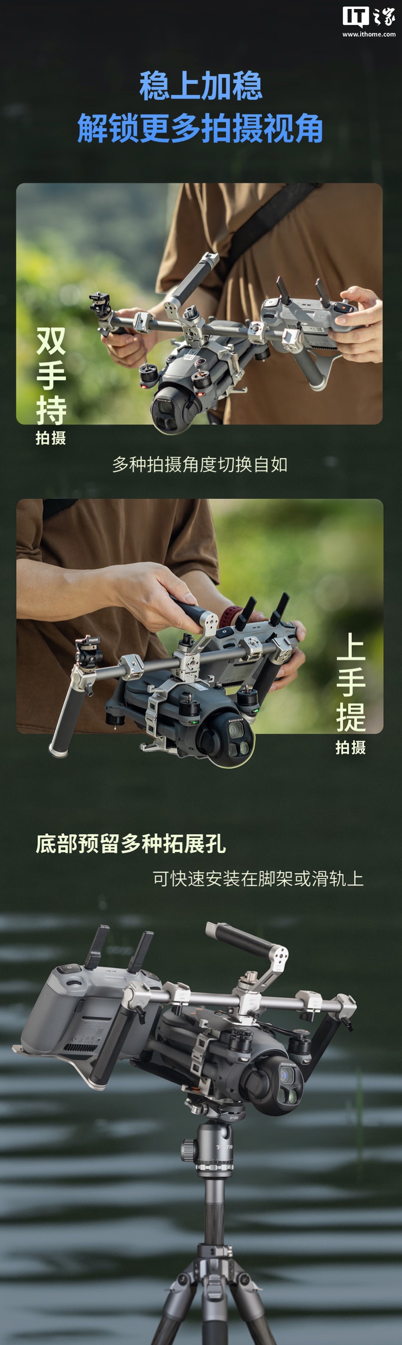 据介绍,相应套件采用铝合金材质,支持双手持、上手提拍摄,可实现无工具快拆,套件底部预留多种拓展孔,可快速将设备安装在脚架或滑轨上。