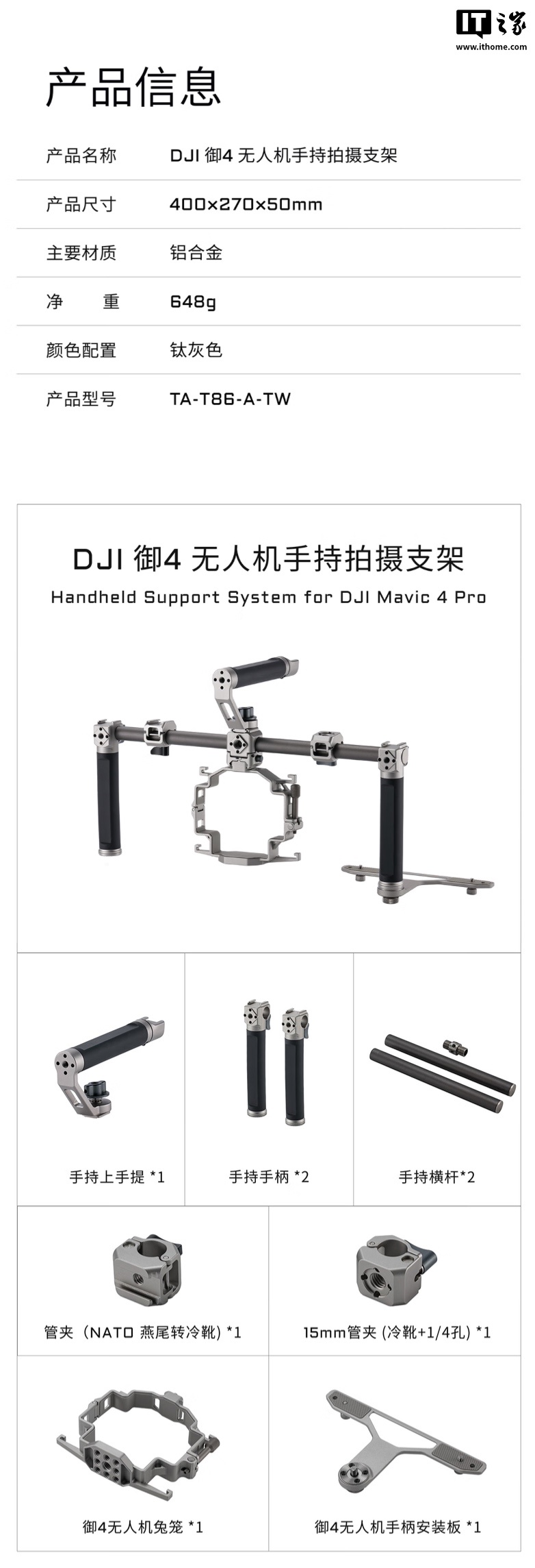 IT之家 7 月 21 日消息,外设制造商 TILTA 铁头现已为大疆 Mavic 4 Pro 无人机推出一款手持拍摄支架套件,允许将这款无人机作为手持云台相机使用,定价 899 元。