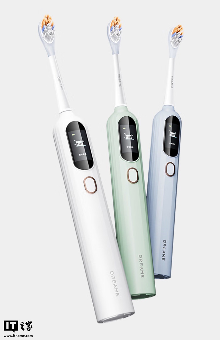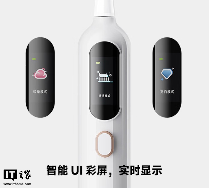 这款牙刷可选三种配色,支持 IPX7 防水,配备一块屏幕,用户可实时查看目前牙刷电量及牙刷工作模式。